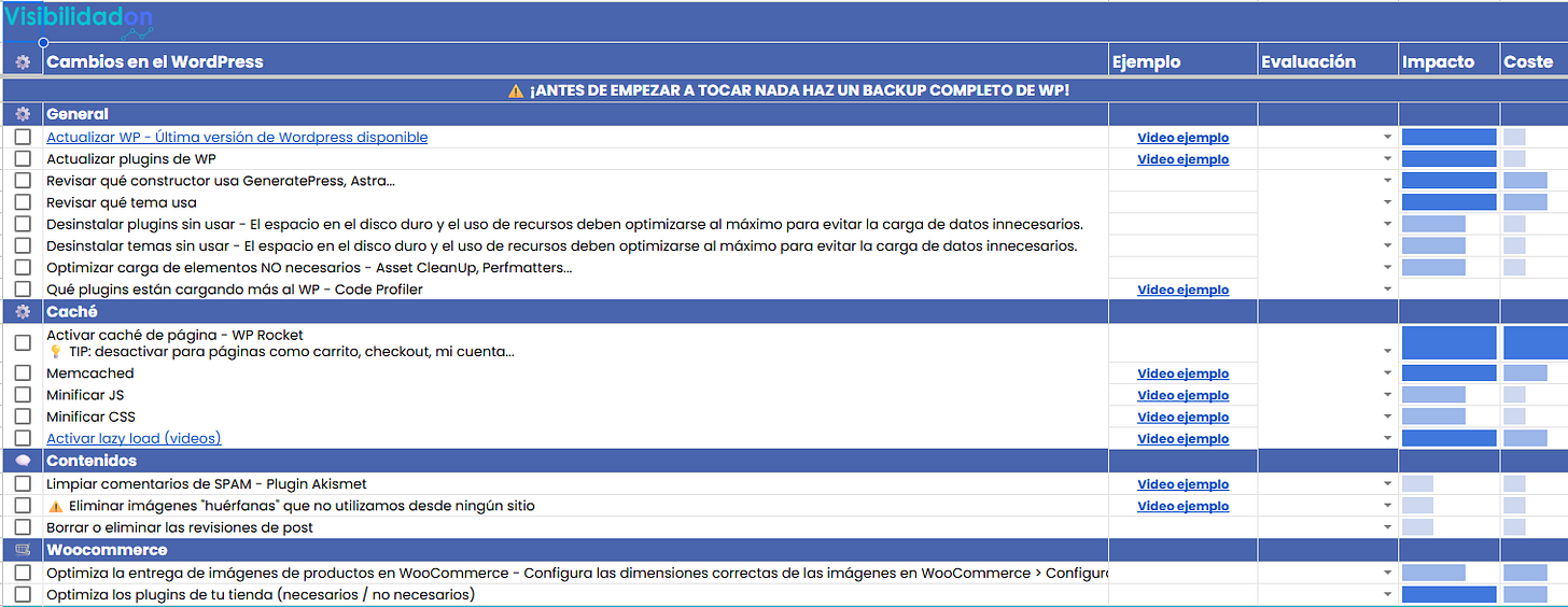 [Checklist de WPO] La más completa checklist de WPO para Wordpress que he creado jamás, dividida en grupos Servidor, Wordpres, Multimedia, Base de datos y Recursos donde encontrarás un montón de recursos útiles y videos ejemplo para aplicar los cambios.