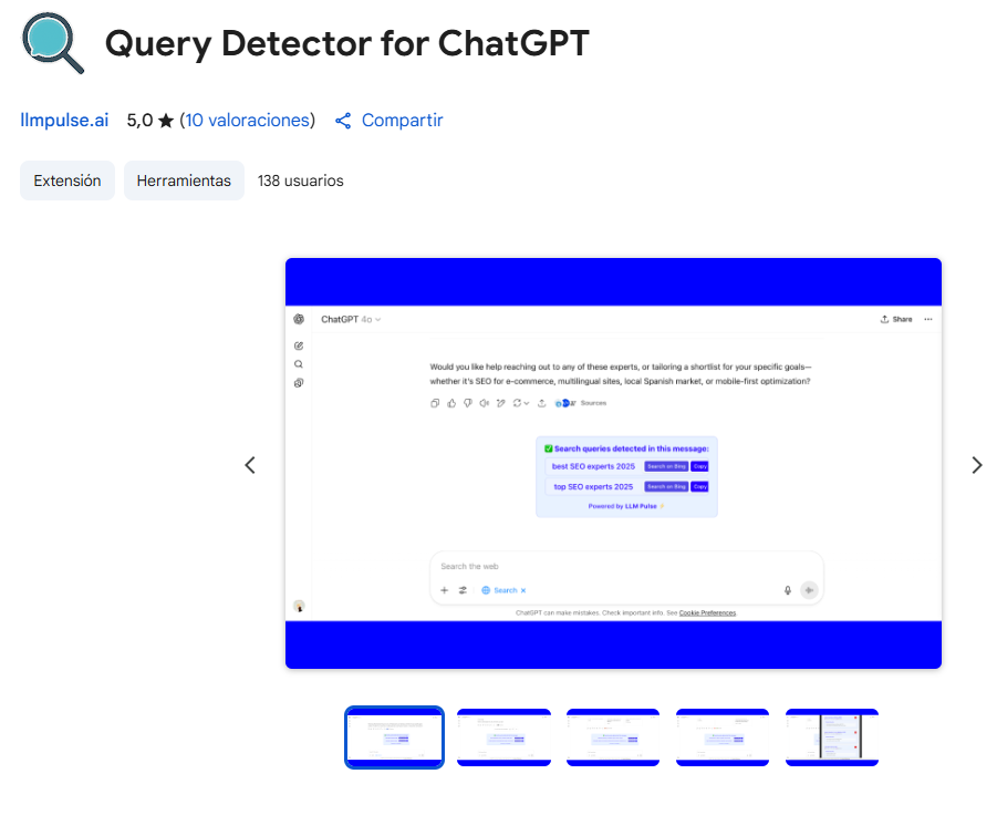 Ahora incluye detección en tiempo real durante la generación de respuestas, historial privado de queries exportable a Google Sheets, opción de activar/desactivar según necesidad y mejoras en UI. Permite analizar fácilmente cómo busca ChatGPT internamente y sacar conclusiones de patrones de consulta para optimización SEO en IA.