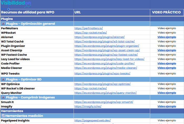 Además de una pestaña de Recursos donde encontrar todo lo que necesites para que tu web vaya más rápido (plugins, herramientas, artículos, tutoriales…).