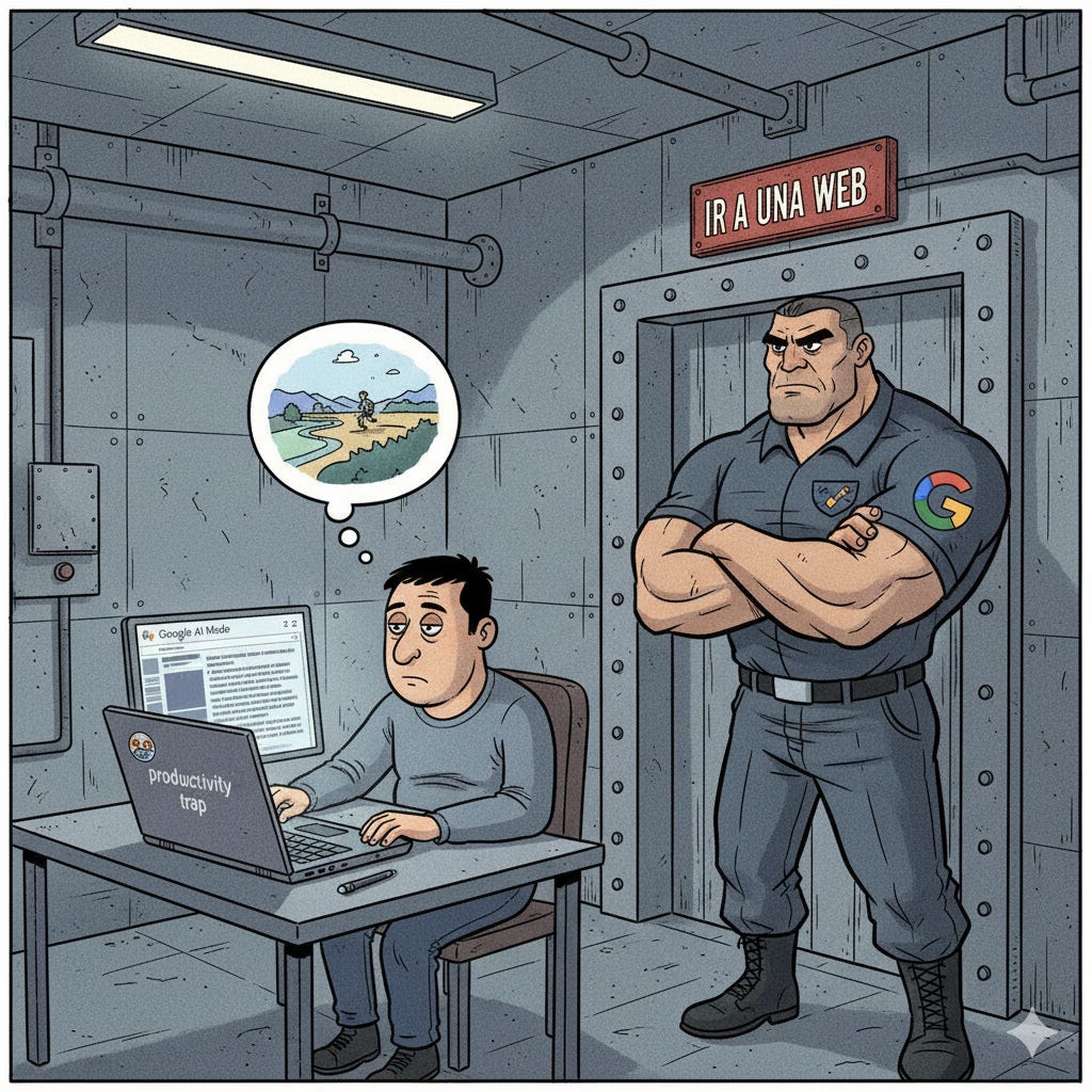 Hoy en día, hablamos mucho de cómo Google retiene el tráfico con sus AI Overviews, su Modo IA o sus fragmentos destacados. Sentimos que la “web abierta” está en declive, y nuestra viñeta de esta semana lo representa a la perfección: un usuario casi prisionero en la burbuja de Google.