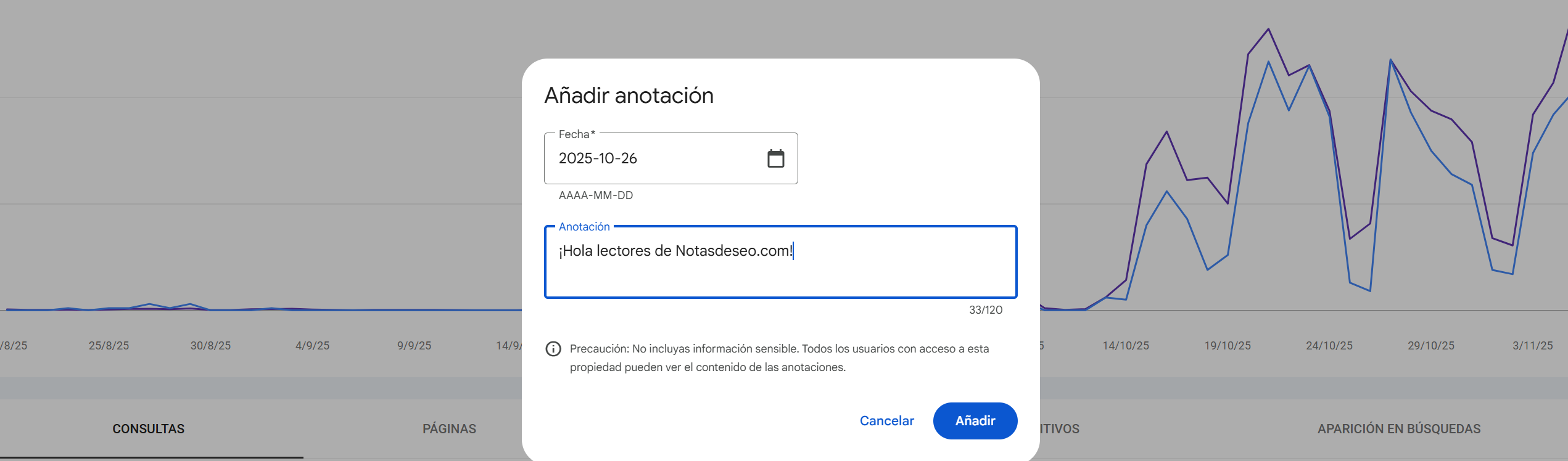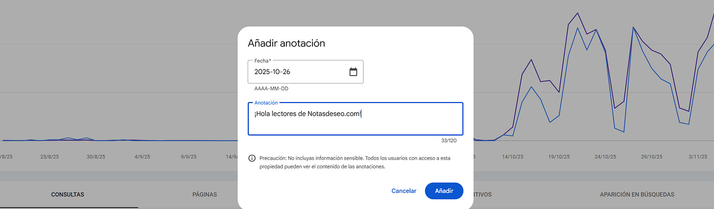[✏️ ¡Por fin! Llegan las anotaciones personalizadas a los informes de Google Search Console] Esta semana ha “habido movimiento” en las oficinas de Google, han lanzado la funcionalidad de poner anotaciones en las gráficas de GSC, ¡se habrán quedado a gusto después de años esperando!