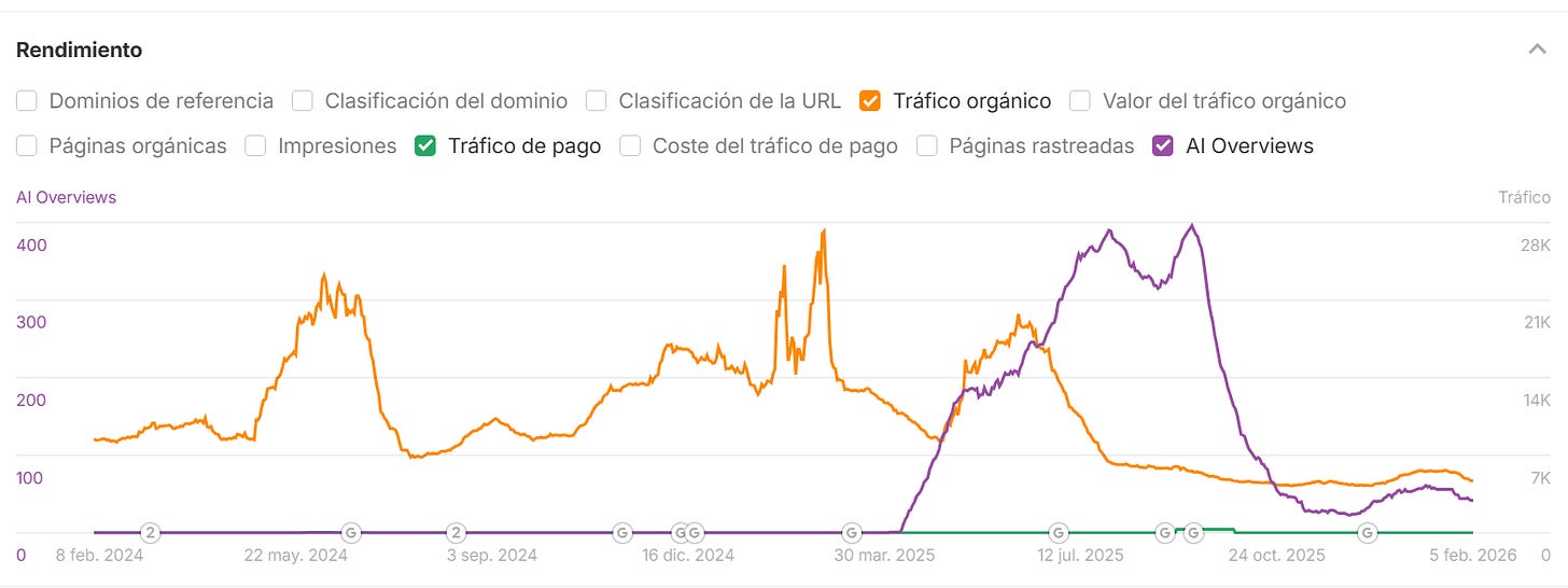 No sé si llevará más tiempo, pero yo lo he empezado a usar esta semana, en el resumen general de aHrefs una nueva gráfica de nuestra visibilidad en AI Overviews, que esperamos que poco a poco nos vayan dando más contexto de cómo nuestra web se ve en el entorno de IAs.